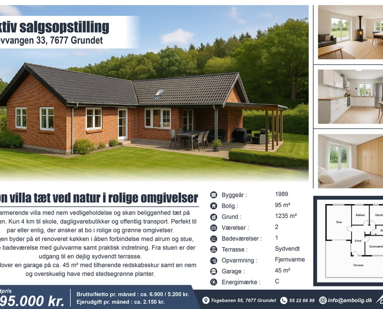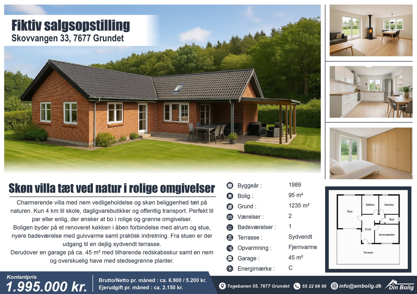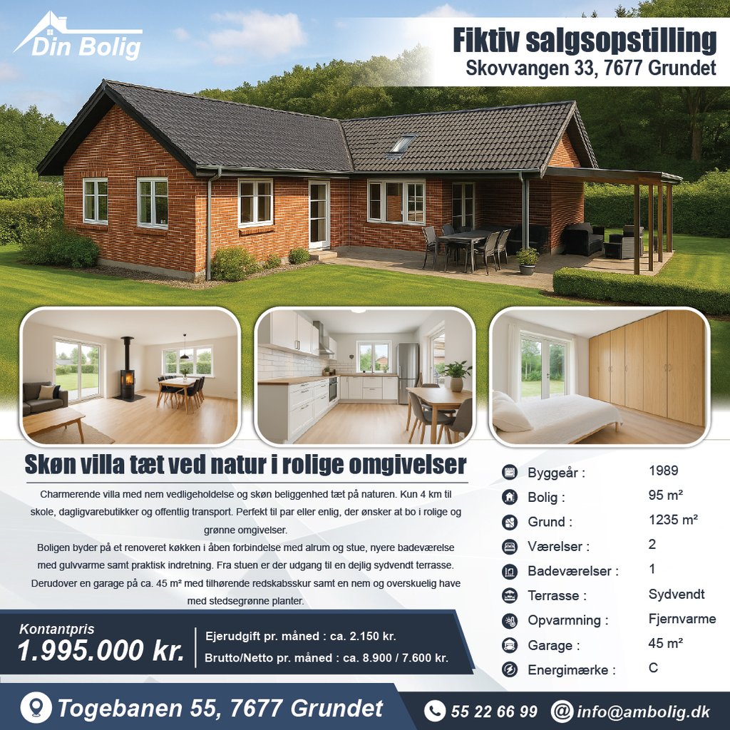 En A4 salgsopstilling giver potentielle købere et hurtigt overblik med klare billeder, nøgletal og beskrivelse – perfekt til udstillingsvinduet eller som PDF til kunder.